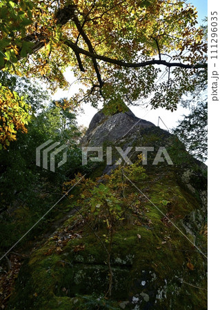 秩父札所32番法性寺の奥之院のお船岩の痩せ尾根南端部の道標に大日如来像のある岩塊