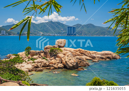 Stunning views of Nha Trang beach and skyscrapers from the island. Hon Chong cape rock garden. urban landscape.
