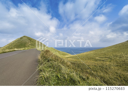 北海道・礼文島 海沿いの丘陵と青空 / Rebun Island, Japan