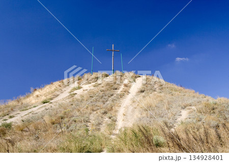 Wooden cross on the mountain. Khortytsia. Ukraine