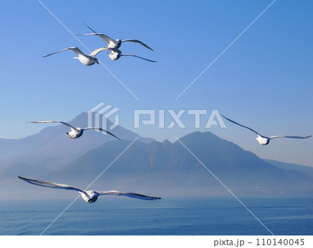 朝の日差しと野鳥(カモメ) うららかな春空を背景にフェリー航海 (長崎県島原市・熊本県・有明海)