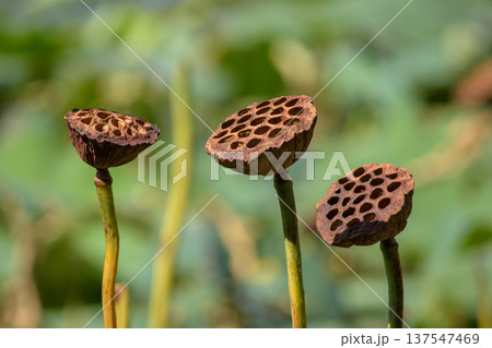 Dried lotus seed pods with green bokeh background