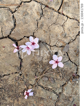 Fallen Prunus cerasifera blossoms on cracked dry soil with sparse grass shoots. Drought impact, seasonal transition, ground texture, urban spring residue, fragility and water shortage narrative