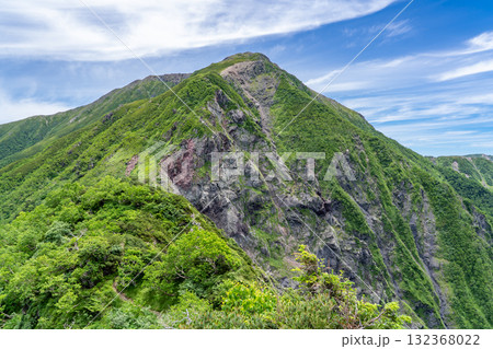 兎岳の登山道から見る前聖岳と聖岳大崩落 南アルプス聖岳と兎岳登山