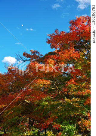秋の京都嵯峨野 平安郷 紅葉に染まった楓と上弦の月