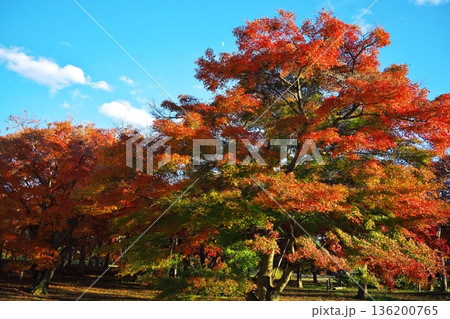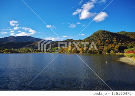 秋の京都嵯峨野 紅葉に染まった広沢池の湖畔