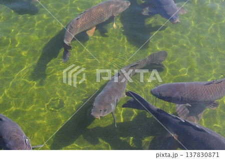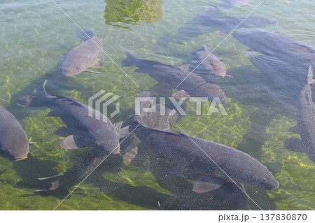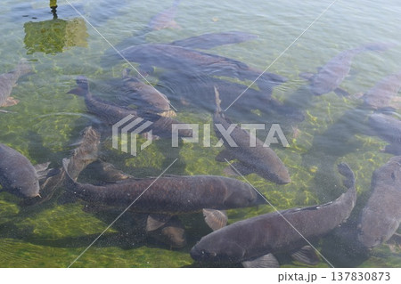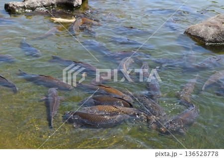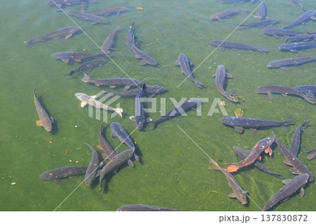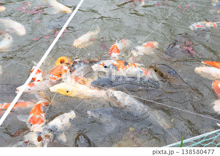 餌に群がる鯉、錦鯉の写真