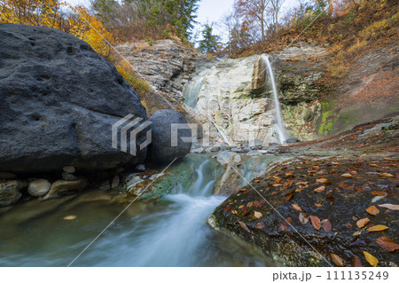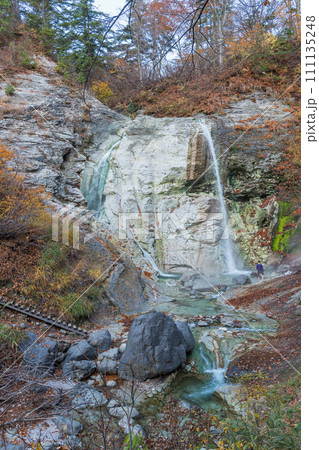 日本 秋田県湯沢市の川原毛地獄の紅葉と川原毛大湯滝