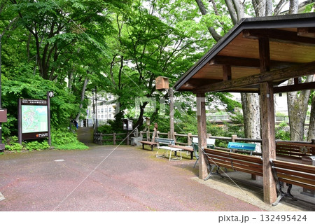 日光市川治温泉 川治ふれあい公園のかわじいの湯と散策路と新緑