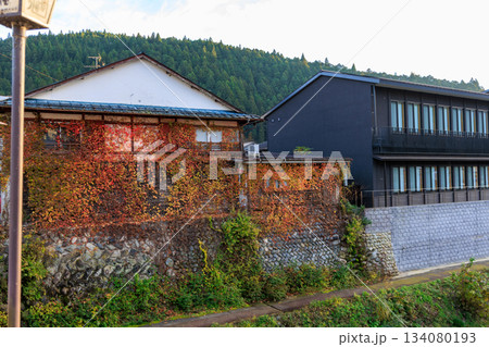 郡上八幡の川沿いに建つ蔦に覆われた古い建物の秋の風景