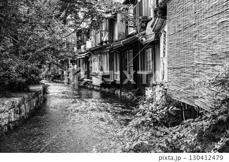 路地裏に流れる川と古民家のある日本の風景(モノクロ)