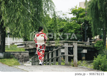 着物で京都を散策する若い女性