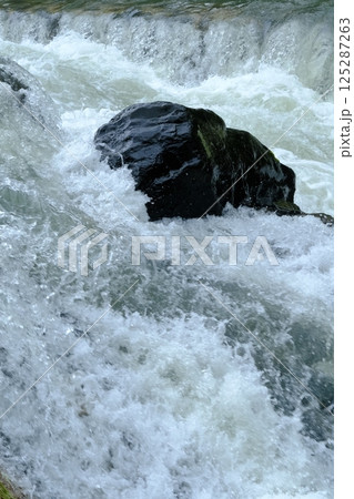 梅雨で増水した高野川の水流のアップ