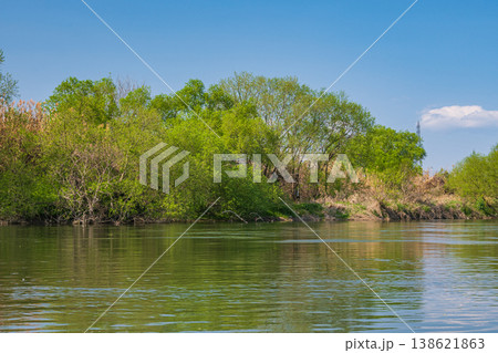 桂川風景 新緑の木々 京都市