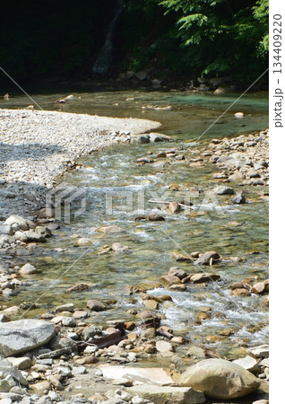 群馬県中之条町・万沢林道を流れる白砂川の清流と夏の緑景