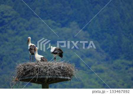 兵庫県 豊岡市 ハチゴロウの戸島湿地 人工巣塔で休むコウノトリ