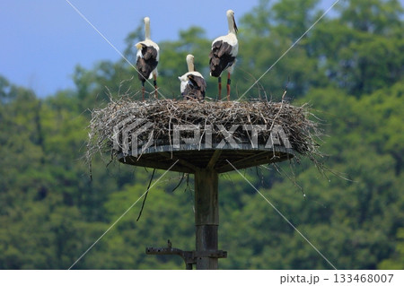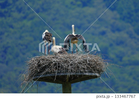兵庫県 豊岡市 コウノトリの郷公園 人工巣塔で休むコウノトリ兵庫県 豊岡市 コウノトリの郷公園 人工