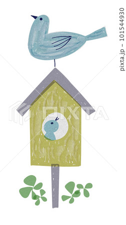 Bird in house. Cute birdhouse. Spring childish colorful home. Summer nature art. Garden wood decoration. Nesting box. Starling building with feeder. Cartoon animal shelter set. Vector flat tidy design