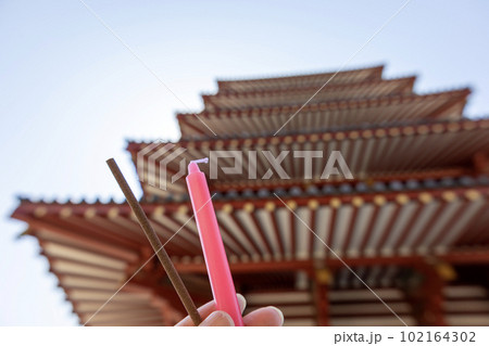 大阪・四天王寺「五重塔の前で蝋燭と線香を持った手」(2023年4月1日撮影)