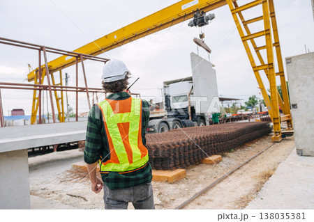 Professional engineer male working in concrete precast plant factory control operate lifting crane in construction site .