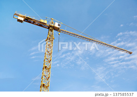 Construction cranes on the background of the sky at sunset. Construction of new residential complex.