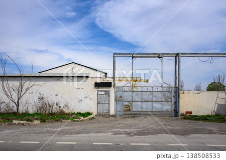 An Old abandoned building facade architecture with broken window ,concrete surface and green lawn