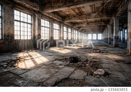Abandoned Industrial Factory Hall with Broken Floor and Sun Rays Through Large Windows