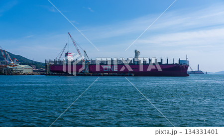 造船クレーンと造船中のタンカーを望む呉港の造船所風景
