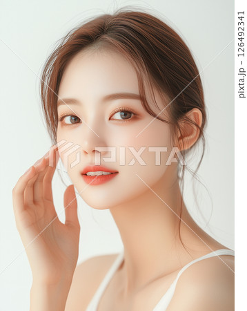 Elegant Korean beauty portrait featuring natural makeup and soft lighting in a studio setting