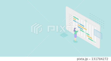 ガントチャートでプロジェクトの進捗確認をする女性マネージャー。アイソメトリックなベクターイラスト