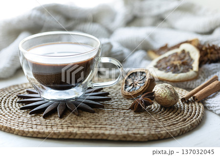 Autumn composition with a cup of hot drink close-up.