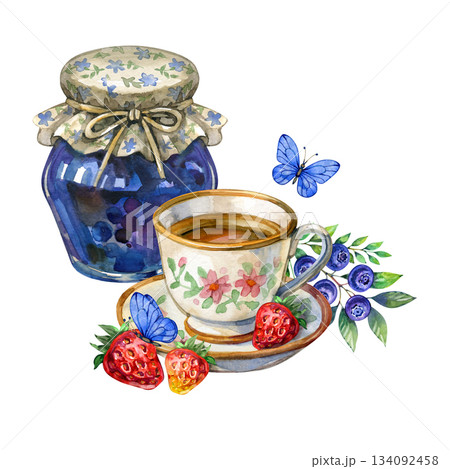Watercolor composition with tea cup, berry jam jar, strawberries, blueberries and delicate blue butterflies. Cozy cottagecore illustration perfect for packaging, prints, kitchen d cor and greeting