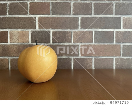 左下に置かれたナシとレンガの背景