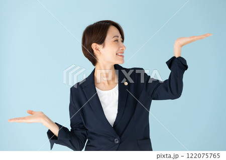 右手と左手の上のものを比べるようなジェスチャーの若い女性