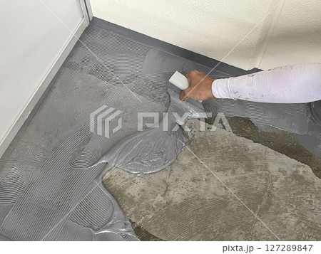 分譲マンションのバルコニーの長尺シート張替え工事にてボンド塗布