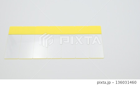 白背景の中段左寄せに縦置きで並べたスライドガラス7枚の標準アングル写真