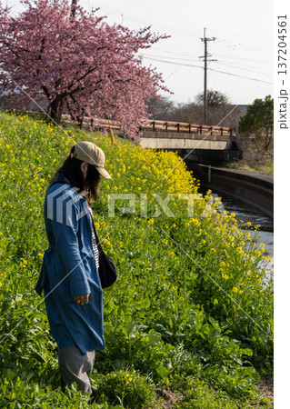 河津桜と菜の花の春風景に立つ女性