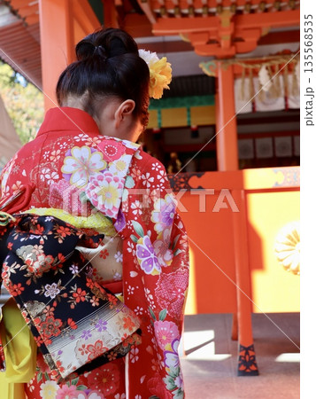 子供の神社参拝シーン 香椎神宮でお参りをする着物の子供の後ろ姿 広告・記事、Web向け商用写真素材