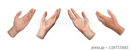 Hands, palms reaching out, stretching to something, isolated on white background, set.