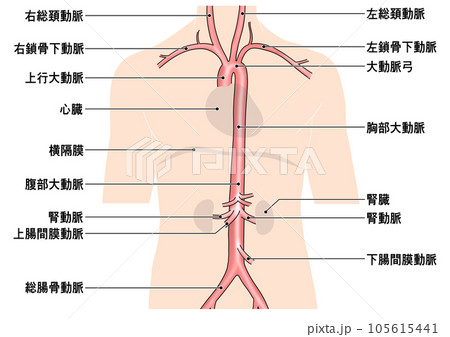 首から腰までのシンプルな大動脈概略図