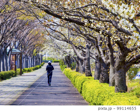 新左近川親水公園の桜並木の下でジョギング