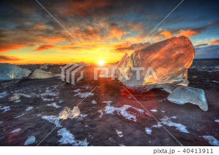 Beautiful sunset over famous Diamond beach, Iceland