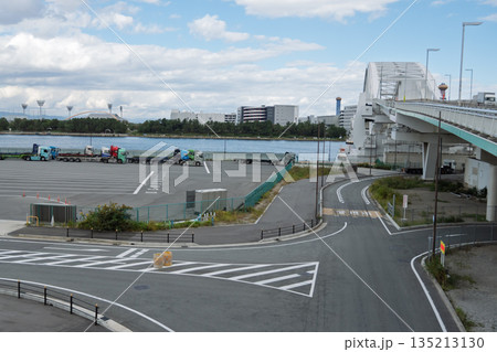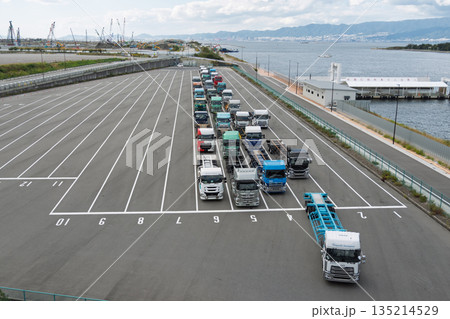 大阪港・夢洲のコンテナターミナルで待機するトレーラー群と夢舞大橋の風景(物流・2024年問題)