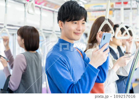 電車でスマホを見る若い大学生 撮影協力「京王電鉄株式会社」