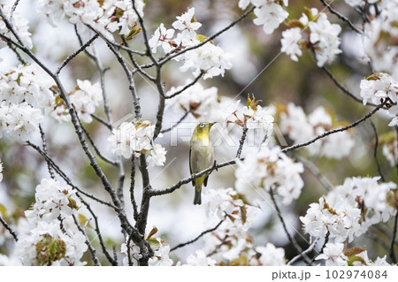 美しいシダレザクラの間を飛び回って花の蜜を吸う可愛いメジロ(メジロ科)。神奈川県横浜市三ツ池公園