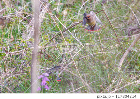 地面に降りヤブラン(スズラン亜科)の実を食べる美しいヒレンジャクとキレンジャクの群れ(レンジャク科)