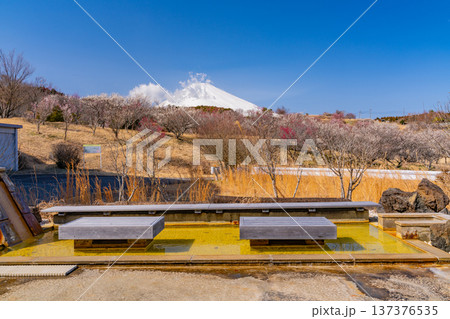 (静岡県)裾野市梅の里 満開の紅白梅 新雪富士