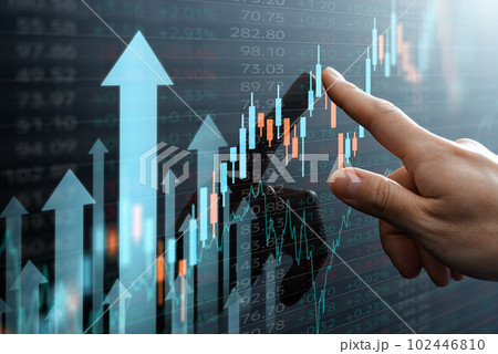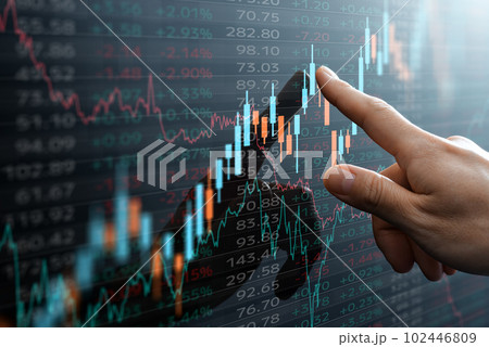 ローソク足チャートと金融市場のデータ。チャートを指し示す手。