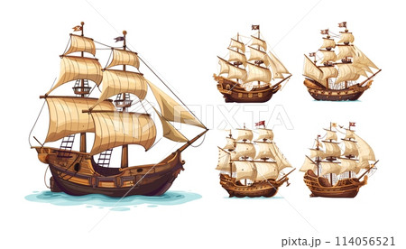 Pirate ships cartoon vector set. Sailing marine galleon caravel corvette combat medieval ocean transport sea hunters robbers bandits, highlighted illustrations on white background