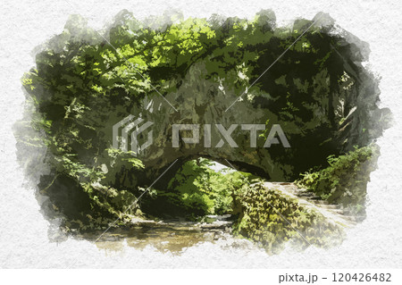水彩画風 帝釈峡 鬼の唐門 広島県庄原市